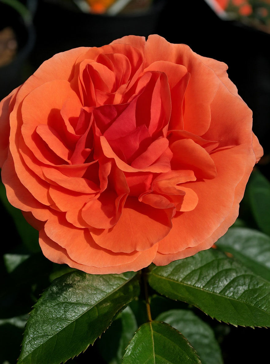 Blüte: Dunkelorange bis lachsrosa, nostalgisch gefüllt, schalenförmig, starker Duft, 8 bis 10 cm groß.