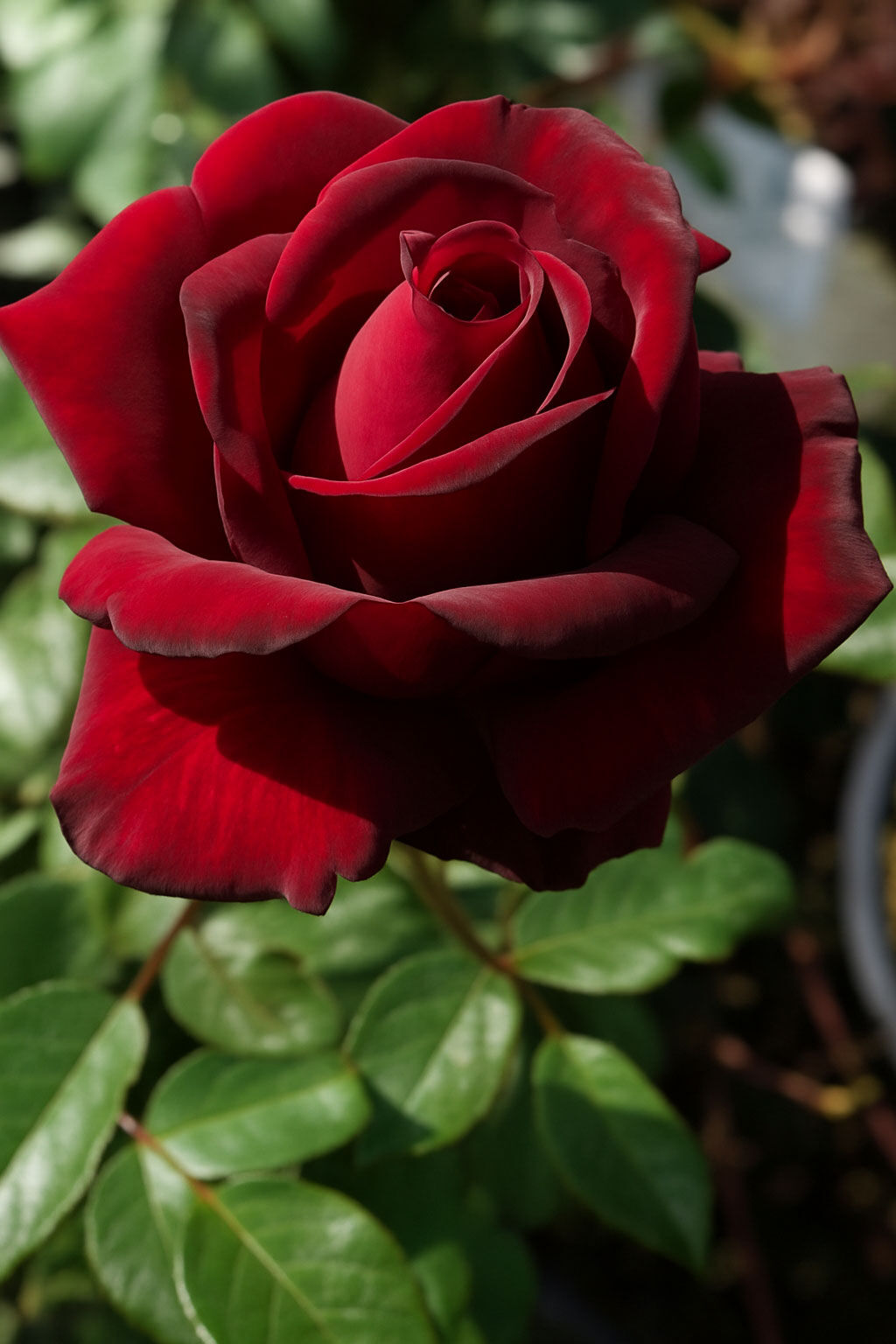 | Blüte: | Dunkelrot, gefüllt, becherförmig, samtartig, leicht duftend, 5 bis 10 cm groß. |