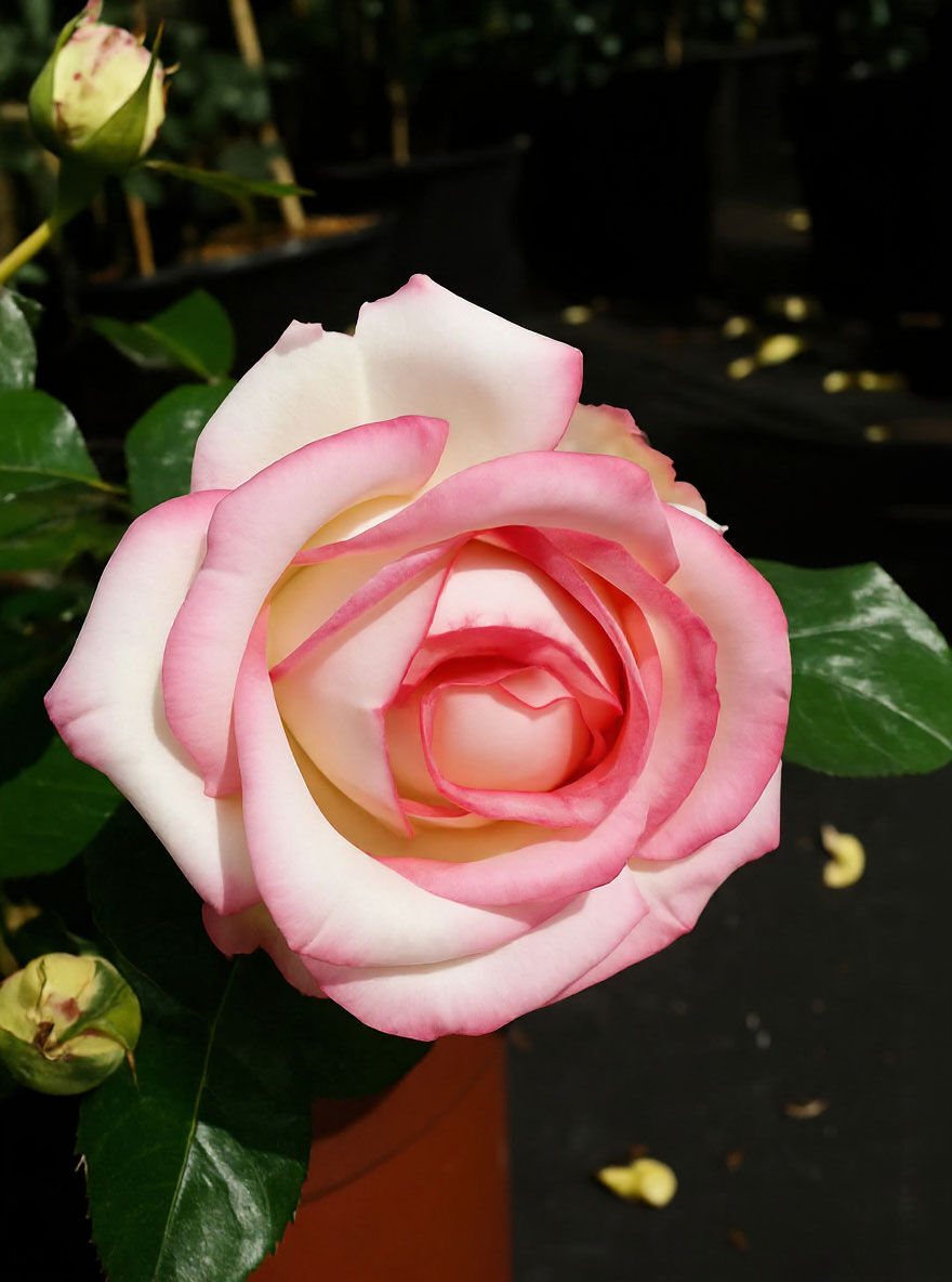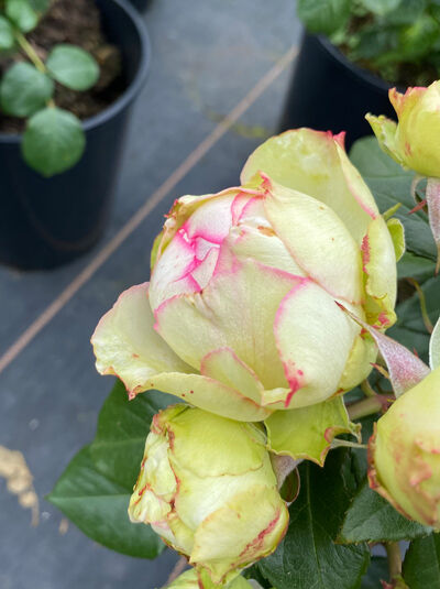 | Blüte: | Weiß mit kirschrotem Rand, stark gefüllt, ballförmig, edelrosenähnlich, dezent duftend, öfterblühend, 8 bis 10 cm groß. |