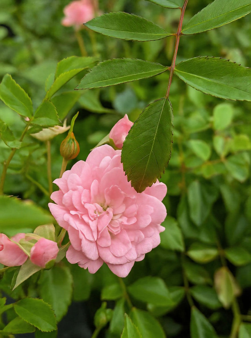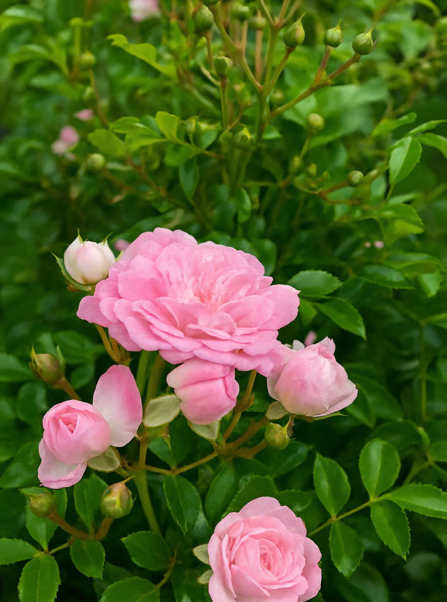 | Blüte: | Lachsrosa, gut gefüllt, dezent duftend, in Dolden, kleinblumig, 2 bis 3 cm groß |