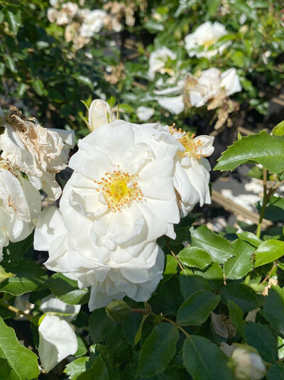 | Blüte: | Strahlend weiß, gelbe Staubgefäße, locker gefüllt, in Dolden, leicht duftend, reich- und öfterblühend, 5 bis 10 cm groß. |