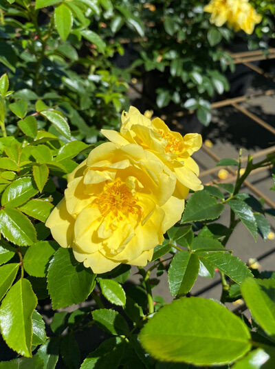 | Blüte: | Leuchtend gelb, halbgefüllt, in Dolden stehend, leicht duftend, öfterblühend, 5 bis 10 cm groß. |