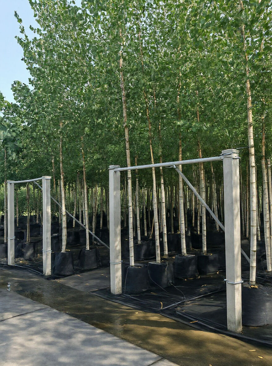 Sand-Birke (Betula pendula) als Baumschulware, mehrere Jungbäume mit weißen Stämmen und grünem Laub in Pflanzsäcken.