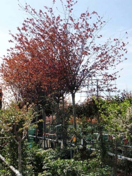Die Prunus cerasifera ’Nigra‘ ist ein viel gepflanzter Zierbaum, der in vielen heimischen Gärten zu finden ist und in Europa als sehr populär gilt. Die Selektion begeistert mit einem roten Blattkleid und bringt ganzjährig malerische Farbmomente in den Garten. Sie ist deutschsprachigen Raum daher ebenso unter dem Namen Blutpflaume im Handel erhältlich. Der kleine Baum eignet sich aufgrund seines langsamen Wachstums und einer geringen Endhöhe hervorragend als Hausbaum und bringt einen Hauch von Exotik in den heimischen Garten.