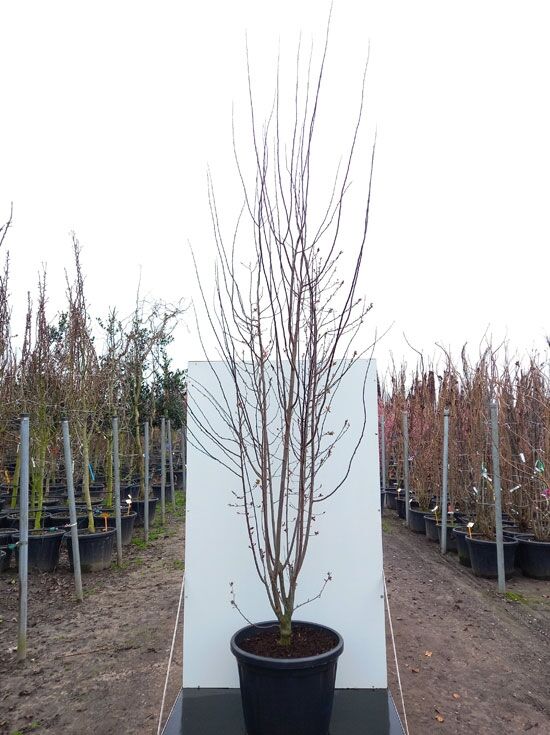 Detaillierte Beschreibung: | Herkunft und Besonderheit der Blut-Pflaume / Prunus cerasifera ’Nigra‘Die Prunus cerasifera ’Nigra‘ ist ein viel gepflanzter Zierbaum, der in vielen heimischen Gärten zu finden ist und in Europa als sehr populär gilt. Die Selektion begeistert mit einem roten Blattkleid und bringt ganzjährig malerische Farbmomente in den Garten. Sie ist deutschsprachigen Raum daher ebenso unter dem Namen Blutpflaume im Handel erhältlich. Der kleine Baum eignet sich aufgrund seines langsamen Wachstums und einer geringen Endhöhe hervorragend als Hausbaum und bringt einen Hauch von Exotik in den heimischen Garten. Beliebte Züchtung ist in Europa sehr verbreitetDie Blutpflaume wurde bereits im Jahr 1916 in den USA selektiert und fand schnell ihren Weg auf den europäischen Markt. Hier gilt sie mittlerweile als eine der populärsten Kirsch- bzw. Pflaumenbäume. Sie gehört zur Gattung der Prunus in der großen Familie der Rosengewächse (Roseacea). Die Kirschpflaume stammt aus AsienDie Wildart Prunus cerasifera ist auch unter der Bezeichnung Kirschpflaume oder Myrobalane bekannt und wächst in der freien Natur Vorderasiens. Sie hat seit vielen Generationen eine Tradition in Europa und ist mittlerweile auch bei uns in vielen Regionen verwildert. Man trifft die Kirschpflaume in der freien Natur in Hecken und an warmen, sonnenreichen Berghängen, wo sie mit ihrem charismatischen Anblick Aufsehen erregt. Blut-Pflaume wird bis zu 7 Meter hochDie Züchtung Blut-Pflaume wächst eher langsam zu einem kleinen Baum oder baumartigen Strauch und erreicht eine ungefähre Endhöhe von bis 7 Metern. Die formschöne Krone bildet sich zunächst rundlich bis kegelförmig und wird nach einigen Jahren etwas unregelmäßiger und offener. Einige Zweige hängen dann leicht über und verleihen der Selektion eine malerische Ausstrahlung. Um sich voll entfalten zu können, benötigt die exotische Schönheit einen Platz von 3 bis 6 Metern, sie ist daher auch für die Verwendung in einem kleineren Garten gut geeignet. Ungewöhnlicher Stamm mit bedornter RindeDer Stamm der Selektion glänzt in einem dunklen Rotbraun und trägt eine schwach gefurchte Struktur. Er wird im Verlaufe des Wachstums zunehmend dunkler. Besonders ungewöhnlich wirken die Dornen, die sich im Laufe der Jahre an der Rinde bilden. Sie verleihen der Blutpflaume eine besondere Exotik und überraschen viele europäische Gärtner mit ihrem originellen Anblick. Extravagantes Blatt der Blut-Pflaume strahlt in leuchtendem RotDas Blattwerk der Blutpflaume brachte ihr den extravaganten Namen ein, denn es treibt zunächst in einem Weinrot aus, bevor es sich zunehmend schwarzrot färbt. Es glänzt wunderschön im Sonnenschein und wirkt nahezu metallisch, sodass ein apartes Zusammenspiel aus der bedornten Rinde und dem strahlenden Blattwerk entsteht. Die einzelnen Blätter der Prunus cerasifera ’Nigra‘ bleiben insgesamt recht klein. Sie stehen wechselständig an den Zweigen.... |