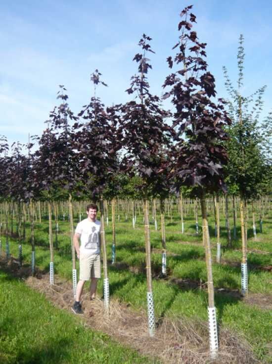 Spitz-Ahorn Acer platanoides 'Royal Red' als Hochstamm, schlanker Stamm mit dunkelrotem Laub in Baumschule.