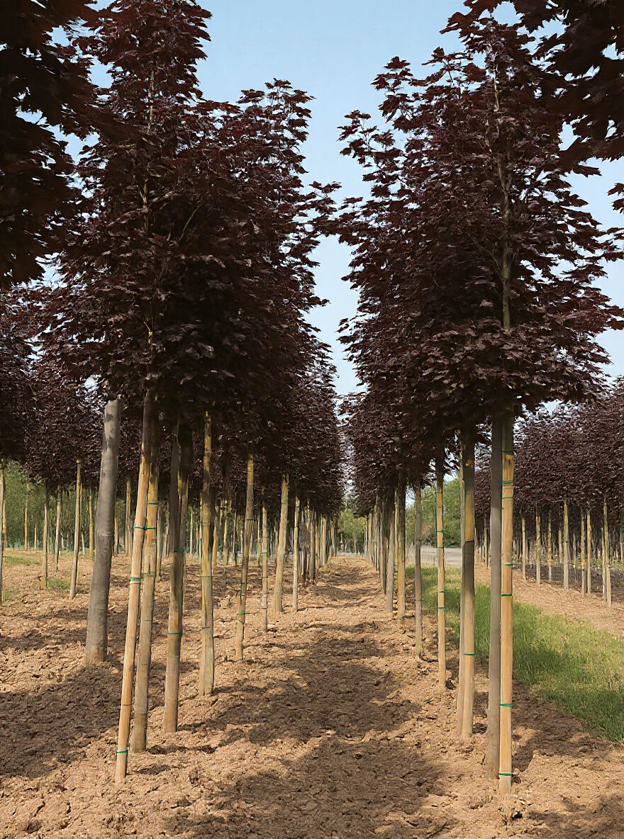 Spitz-Ahorn Acer platanoides 'Royal Red', Hochstamm 14-16 StU, mit rotem Laub, Reihe junger Bäume mit Stützpfählen.