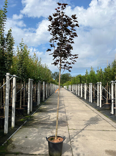 Spitz-Ahorn Acer platanoides 'Royal Red' als Hochstamm, schlanker Stamm mit dunkelrotem Laub in Baumschule.
