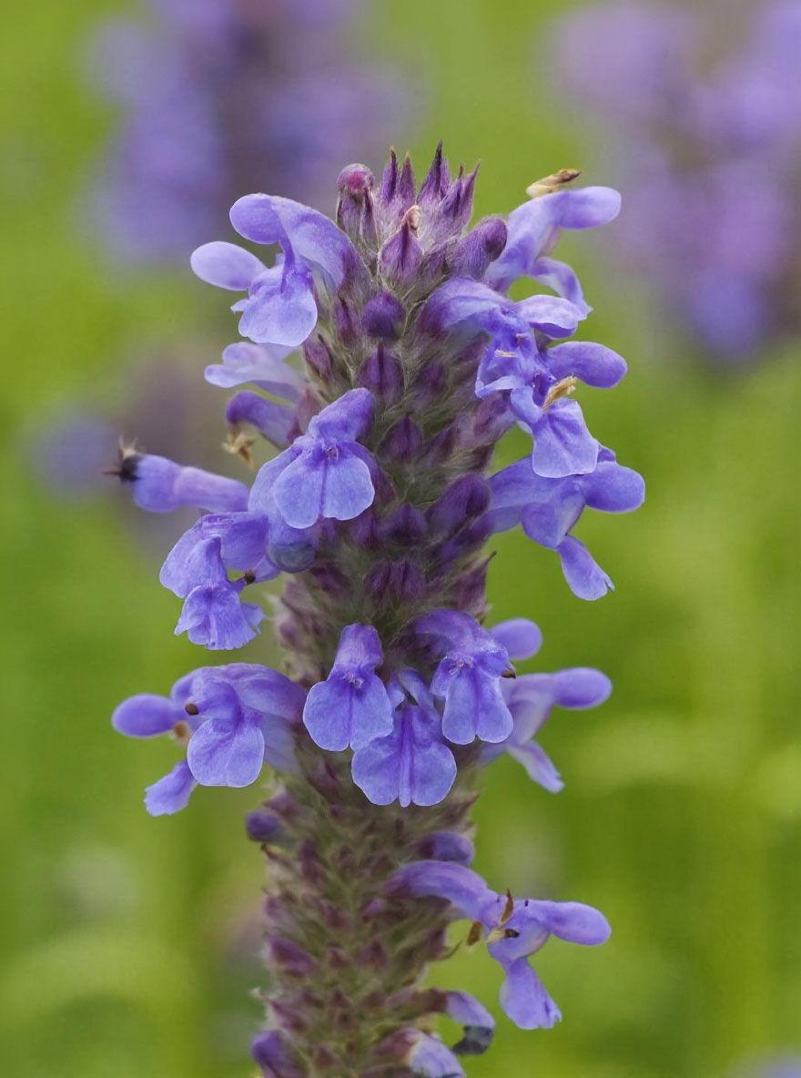 | Blüte: | Purpurblau, lippenförmig, in kolbenartigen Blütenähren, zierend, reichblühend |