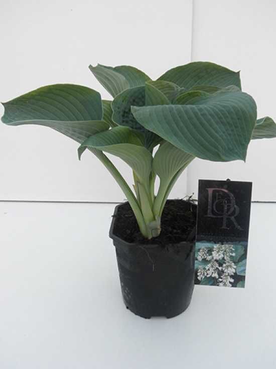 Große Blaublatt-Funkie „Elegans“ (Hosta sieboldiana 'Elegans') im C2-Topf mit blaugrünen, breiten Blättern.