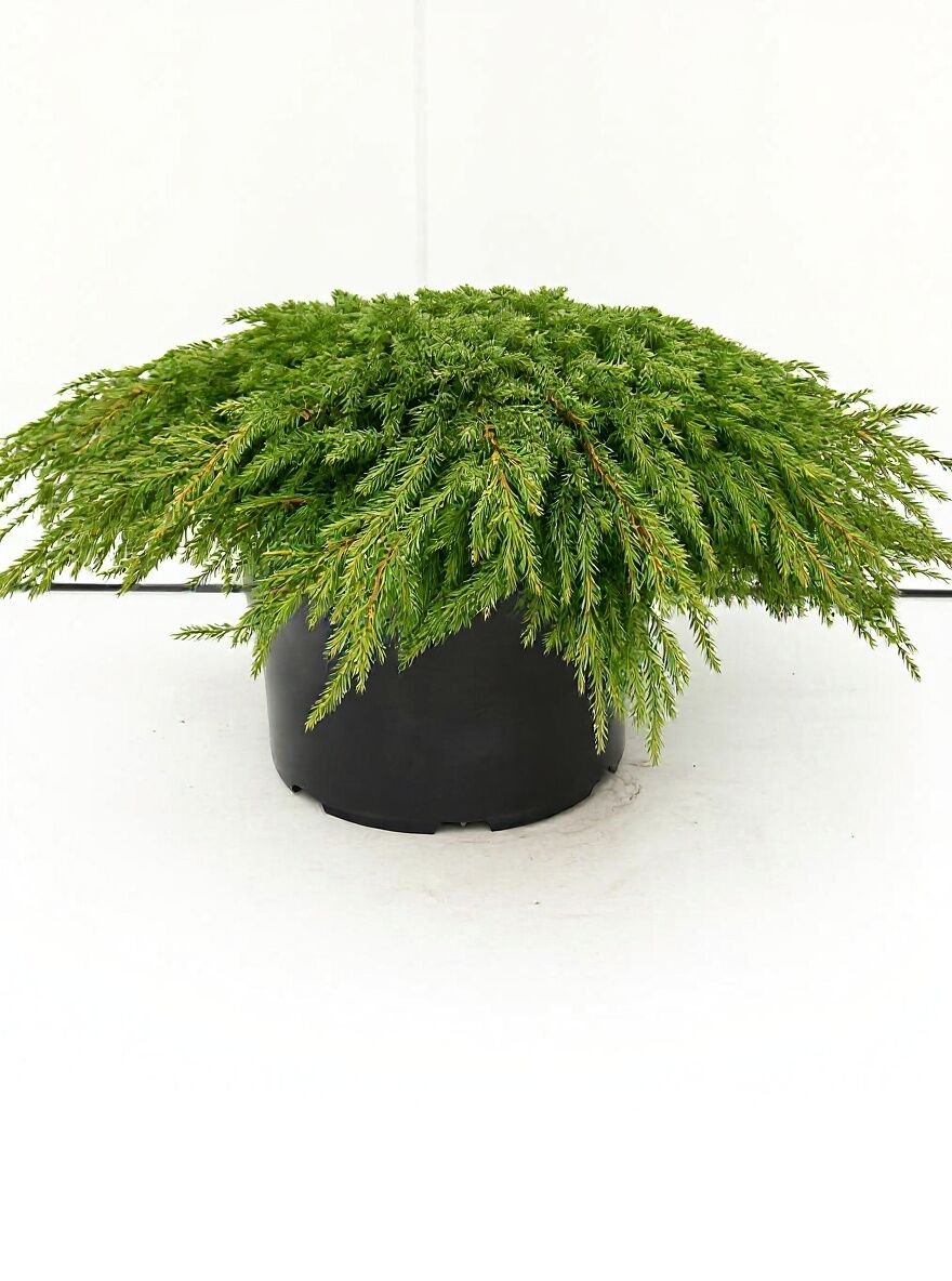 Juniperus communis 'Green Carpet' / Grüner Kriech-Wacholder im schwarzen Topf mit bodendeckendem, nadeligem, grünem Wuchs.
