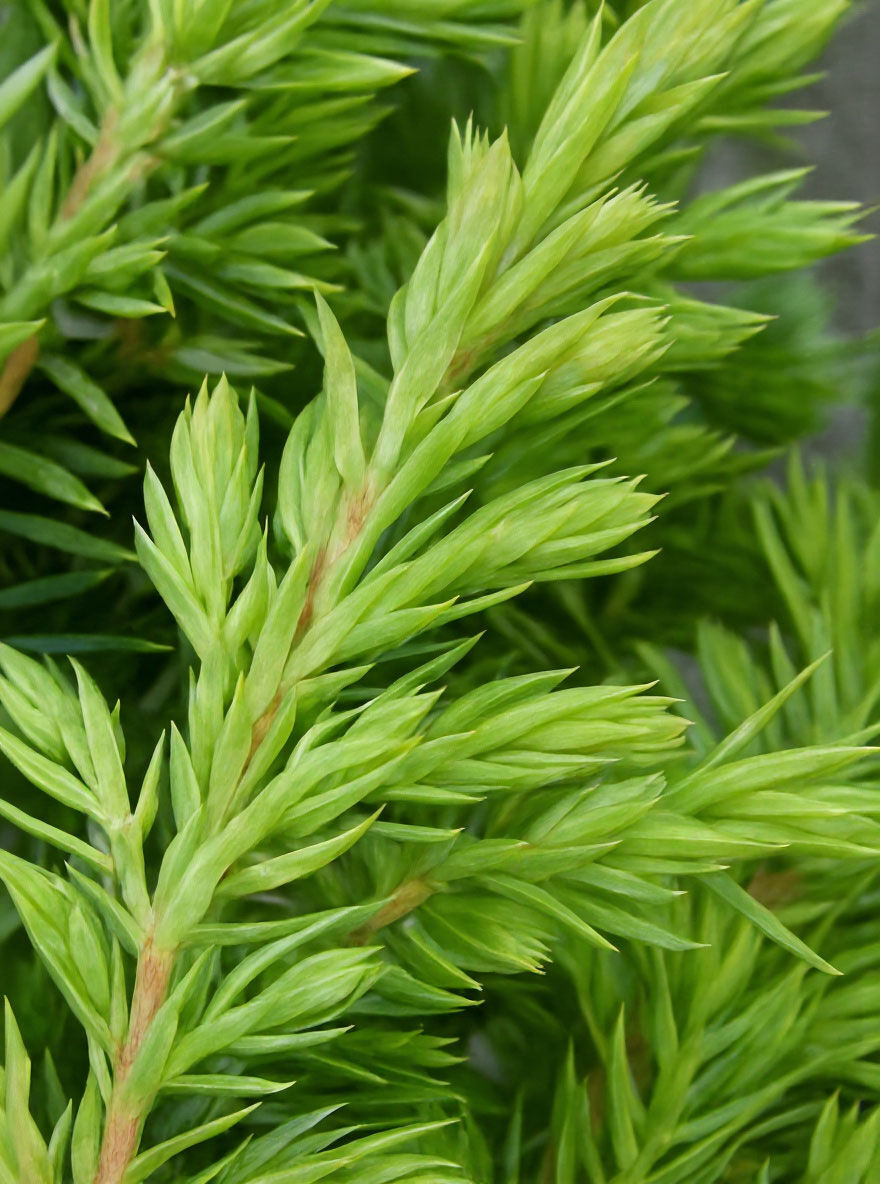 Grüner Kriech-Wacholder (Juniperus communis 'Green Carpet'), Nahaufnahme der hellgrünen, nadeligen Triebe.