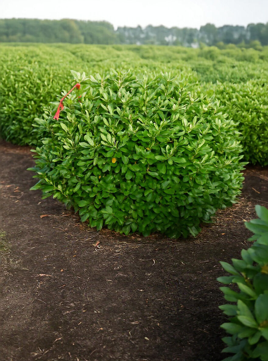 Wuchs: Großstrauch, aufrecht und breitbuschig, gut verzweigt und kompakt, flachkugelig, bis unten belaubt, 300 bis 400 cm hoch und 400 bis 450 cm breit