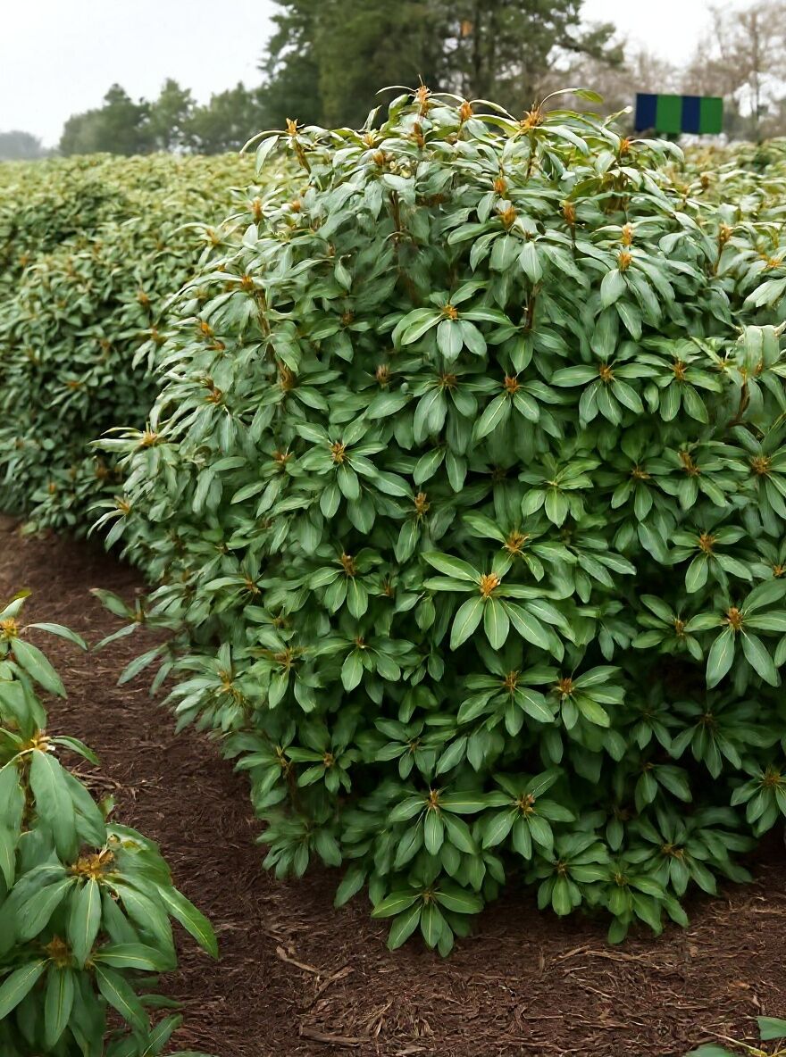 Die Wuchshöhe des Rhododendron 'Roseum Elegans' beträgt in der Regel zwischen 2,5 und 3 Metern. Die Wuchsform ist aufrecht und breitbuschig, wobei die Zweige dicht verzweigt sind und eine kompakte Struktur bilden. Die Pflanze ist besonders robust und widerstandsfähig gegenüber Krankheiten und Schädlingen.