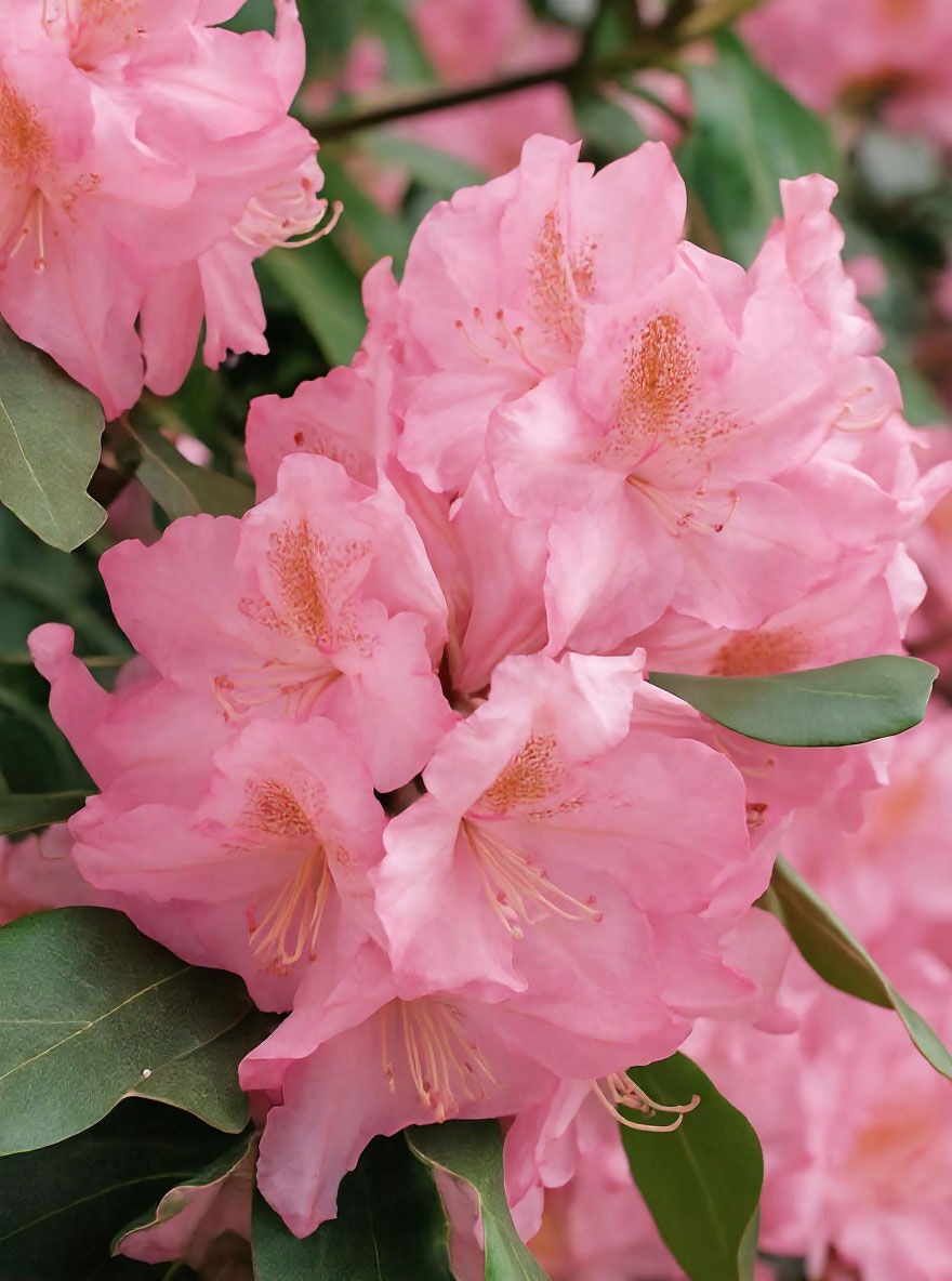 Die Blüten des Rhododendron 'Scintillation' sind atemberaubend schön und kommen in großen Trugdolden vor. Die Blütezeit beginnt im Frühjahr, normalerweise im Mai, und dauert etwa 2-3 Wochen an. Die Blüten sind zart- bis hellrosa und haben einen Hauch von Lila, mit einem leicht rötlichen Rand an den Blütenblättern. Sie sind auch leicht duftend und ziehen viele Bienen und Schmetterlinge an.