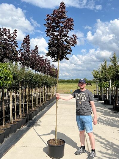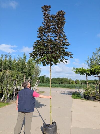 Detaillierte Beschreibung: | Herkunft und Besonderheiten des Acer platanoides ‘Crimson Sentry‘Acer platanoides ’Crimson Sentry‘ ist eine aus den USA stammende Züchtung des in Europa heimischen Spitz-Ahorns. Die Selektion zeichnet sich durch ein intensives leuchtendes Scharlachrot des Blattes aus und ist sehr beliebt im europäischen Raum. ‘Crimson Sentry‘ wächst schmalkronig und eignet sich daher für die Nutzung auf begrenztem Raumangebot. Diese kompakte Wuchsform im Zusammenspiel mit dem traumhaft schönen Blattwerk macht die Selektion zu einem Gartenstar unter den Laubbäumen. Beliebter Baum, von dem es eine Vielzahl an Selektionen gibtDer in Europa heimische Urtyp Acer platanoides ist unter dem Synonym Spitz-Ahorn oder auch Spitzblättriger Ahorn bekannt und gilt als einer der meistgepflanzten Bäume im europäischen Raum. Aufgrund seiner Beliebtheit gibt es mittlerweile eine Vielzahl an Züchtungen, unter denen der Baumfreund je nach Geschmack wählen kann. In freier Wildbahn trifft man ihn auf feuchten, humusreichen Böden in Misch- und Laubwäldern. Sein natürliches Verbreitungsgebiet erstreckt sich von Westeuropa und Südskandinavien bis nach Westasien. Der Spitz-Ahorn Crimson Sentry kann bis zu 200 Jahre alt werdenDer Acer platanoides ’Crimson Sentry‘ stammt aus der Gattung der Ahorne und gehört zur großen Familie der Seifenbaumgewächse. Er erfreut mit einer langen Lebensdauer und wird nicht selten bis zu 150 Jahre alt, sodass man sehr lange seine Freude an dem malerischen Gewächs haben wird. Mittelgroßer Baum mit einer Wuchshöhe von bis zu 10 MeternDer Spitz-Ahorn ’Crimson Sentry‘ entwickelt sich im gemäßigten Tempo zu einem Baum mittlerer Größe. Er erreicht eine Endhöhe von circa 10 Metern und wird bis zu 4 Meter breit. Er benötigt zur Entfaltung seiner Krone nur wenig Platz und ist daher ebenfalls unter dem deutschen Trivialnamen Säulen-Blutahorn bekannt. Schmalkroniger, säulenartiger Wuchs eröffnet vielseitige VerwendungsmöglichkeitenWie der Name Säulen-Blutahorn bereits vermuten lässt, bildet sich die Krone schmal und aufrecht, sodass diese an die Form einer Säule erinnern lässt. Die verzweigte Krone erscheint besonders dichtbuschig und ermöglicht es dem Gärtner durch einen gezielten Rückschnitt eine formschöne Kugel zu erstellen. Blutrotes Blattwerk leuchtet konstant bis in den Herbst hineinEntsprechend seines Namens wird die Selektion ’Crimson Sentry‘ durch das im April austreibende Blatt zu einem farbintensiven Hingucker. Es zeigt sich zunächst mit einer scharlachroten.... |