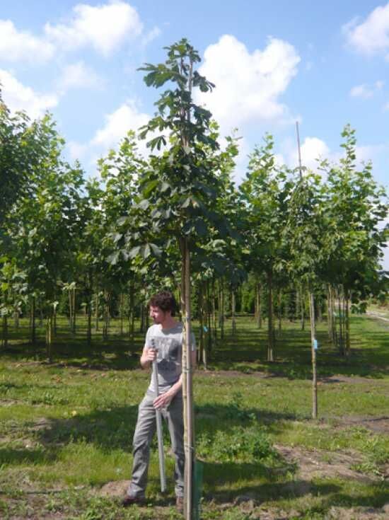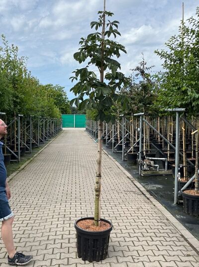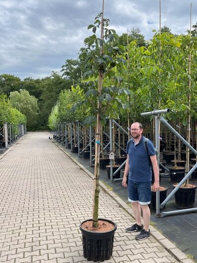 | Detaillierte Beschreibung: | Herkunft und Besonderheit der Gefülltblühenden RosskastanieDie Aesculus hippocastanum ’Baumannii‘ ist eine aus Frankreich stammende Selektion der Gewöhnlichen Rosskastanie. Sie wurde im Jahre 1822 von A.N. Baumann eingeführt und erfreut sich seitdem einer großen Beliebtheit. Ihrem Entdecker zu Ehren erhielt die Gefülltblühende Rosskastanie den Beinamen ’Baumannii‘. Wunderbare Blüte ist das Markenzeichen dieser KastanienartDas wohl herausragendste Merkmal dieser Selektion ist ihre außergewöhnlich schöne Blüte. Wie ihr deutscher Name bereits preisgibt, sind die Blütenrispen gefüllt und wirken besonders formschön und imposant. Herkunft aus SüdeuropaDie Rosskastanie ist ursprünglich beheimatet in Südosteuropa und stammt aus der Gattung der Aesculus. Diese wird der großen Familie der Seifenbaumgewächse zugeordnet. Ihren Namen Rosskastanie verdankt die Aesculus hippocastanum ihrer vielfältigen Nutzung im Bereich der Medizin. Sie diente als Futtermittel für Pferde und wurde an diese verfüttert, um sehr wirkungsvoll Husten und Atemwegserkrankungen zu lindern. Wuchsverhalten der Aesculus hippocastanum ’Baumannii‘Die Gefülltblühende Rosskastanie ist ein sommergrüner, großer Laubbaum. Mit einem recht rasanten Jahreszuwachs von circa 30-40 cm erreicht sie eine Endhöhe von 20 bis 25 Metern und eine Breite von bis zu 20 Metern. Aesculus hippocastanum ’Baumannii‘ wird bis zu 300 Jahre alt und erfreut den Naturliebhaber mit einer außergewöhnlich schönen und breiten Baumkrone. Die Gefülltblühende Rosskastanie überzeugt mit Baumkrone wie aus dem BilderbuchDiese Selektion der Rosskastanie überzeugt mit einem sehr dichten Wuchs ihrer Äste. Die Hauptäste entwickeln sich beinahe horizontal und besitzen herabhängende Zweige mit einem aufragenden Zweigende. Dies verschafft dem großen Baum eine majestätisch wirkende, hochgewölbte Baumkrone wie aus einem Bilderbuch. Sie erscheint besonders dicht und geschlossen und ist daher der perfekte Schattenspender. In jedem Garten oder Park wird die Gefülltblühende Rosskastanie dazu einladen, zu ihren Füssen zu verweilen. Dunkelgraue bis schwarze Rinde schmückt den Stamm der RosskastanieAuch der Stamm der Aesculus hippocastanum ’Baumannii‘ verleiht dieser Zuchtform im Zusammenspiel mit der traumhaften Krone eine malerische Ausstrahlung. Die Struktur der Borke ist schuppig und schimmert sehr dunkelgrau bis schwarz. Die jungen Triebe treiben graubraun aus um dann im Verlaufe der Jahre dunkler zu werden. Der aparte Stamm bildet im Kontrast zu dem herrlichen Blattwerk ein malerisches Bild und wird jeden Baumfreund zum Schwärmen.... |