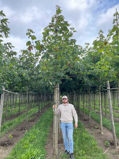 Gefülltblühende Rosskastanie (Aesculus hippocastanum 'Baumannii') Hochstamm 14-16 StU mit Drahtballierung im Feldbestand