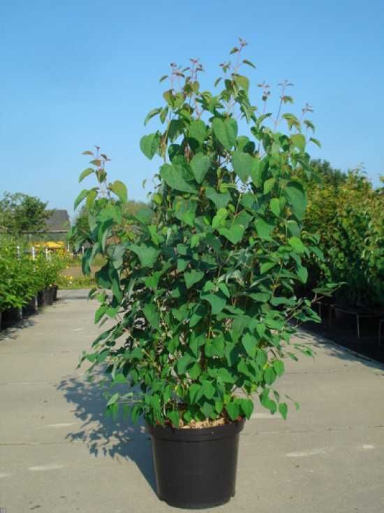 Cercidiphyllum japonicum (Judasblatt/Kuchenbaum) als Topfpflanze im schwarzen Container, mit dichtem Wuchs und herzförmigen Blättern.