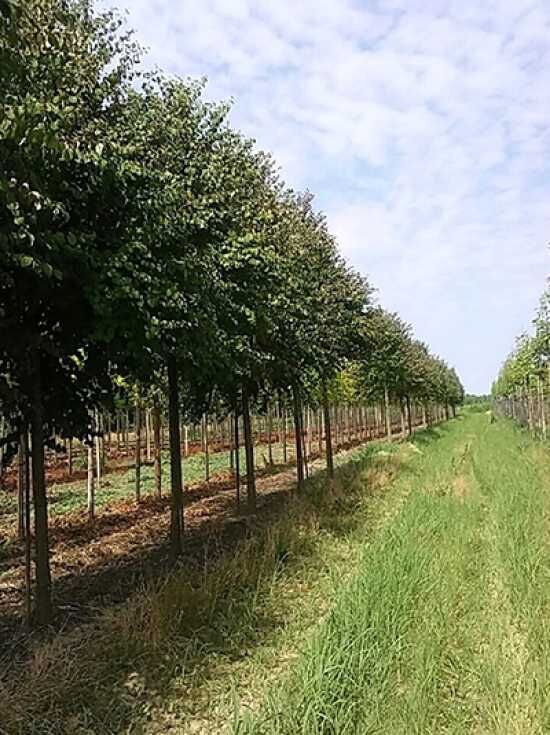 Cercidiphyllum japonicum (Judasblatt/Kuchenbaum/Katsurabaum) Hochstamm 20-25 StU, Reihe von Bäumen mit runder Krone.