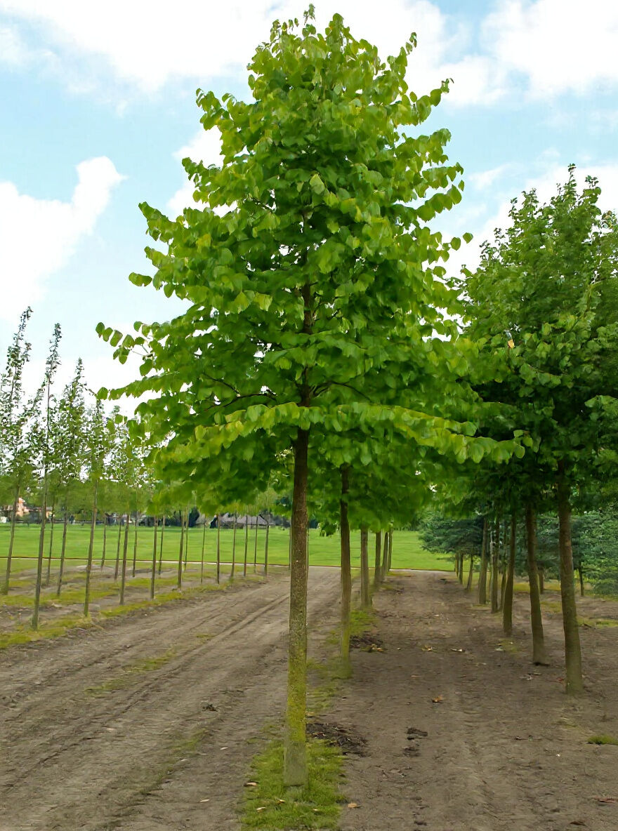 Corylus colurna (Baum-Hasel/Türkische Hasel), junger Baum mit aufrechtem Stamm und dichtem, grünem Laub in Baumschulreihe.