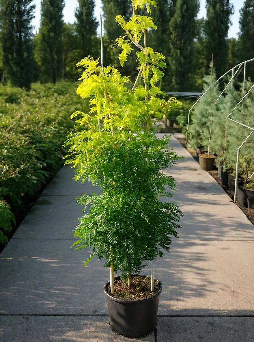 Gold-Gleditschie (Gleditsia triacanthos 'Sunburst') als junger Baum im Container, aufrecht wachsend mit gelbgrünem Laub.
