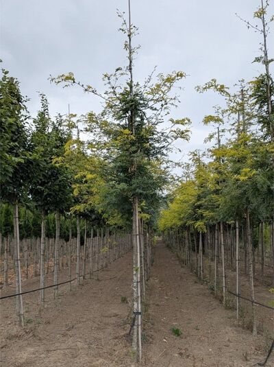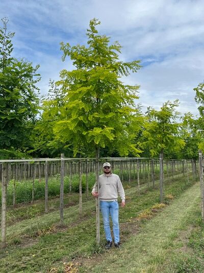 Gold-Gleditschie (Gleditsia triacanthos 'Sunburst') Hochstamm 14–16 StU mit Drahtballen, stehender Baum mit Laubkrone.