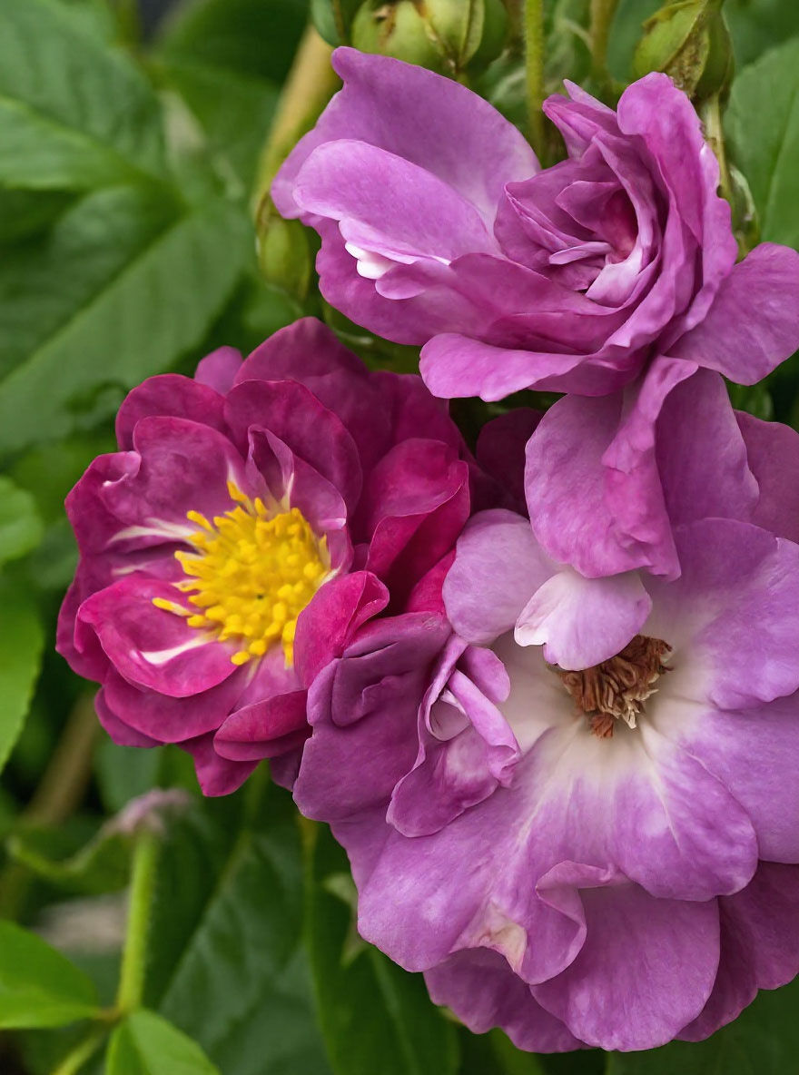 Kletterrose 'Veilchenblau' (Rosa 'Veilchenblau') mit violett-lila Blüten und gelben Staubgefäßen, Nahaufnahme
