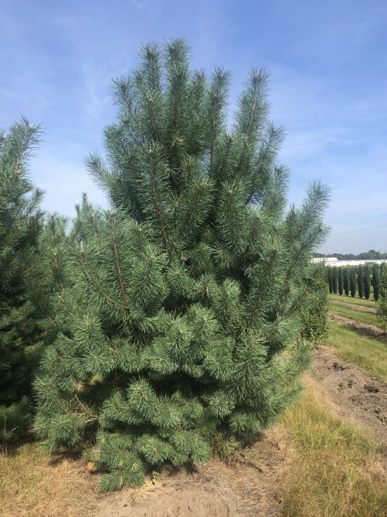 Pinus sylvestris (Gewöhnliche Kiefer) als junger Nadelbaum mit dichtem, grünem Kronenaufbau in Baumschulreihe.