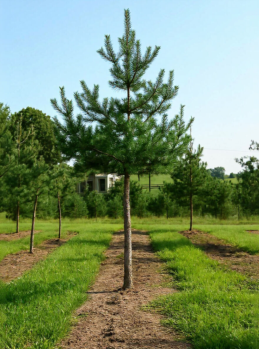 Pinus sylvestris (Gewöhnliche Kiefer) als junger Nadelbaum mit dichtem, grünem Kronenaufbau in Baumschulreihe.
