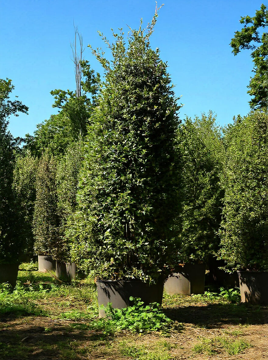 Quercus ilex (Stein-Eiche) als Hochstamm im Topf, mehrere Pflanzen mit dichtem, immergrünem Laub in Baumschule.