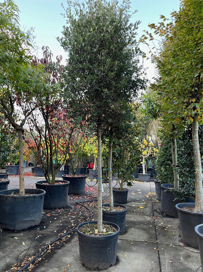 Quercus ilex (Stein-Eiche) als Hochstamm im Container, mit dichtem, immergrünem Laub und geradem Stamm.