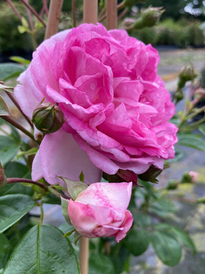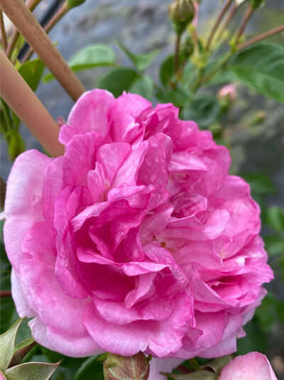 | Blüte: | Violettrosa, stark nostalgisch gefüllt, in Büscheln zusammen, schalenförmig, leichter Apfelduft, reich- und öfterblühend, 6 bis 7 cm groß. |