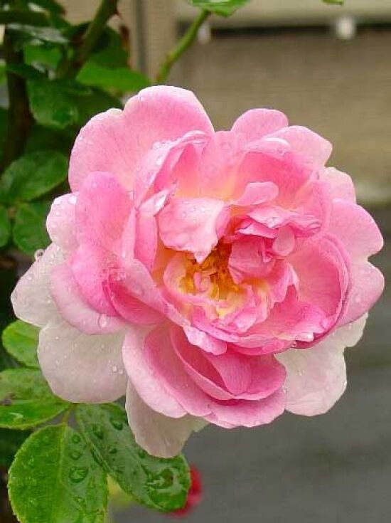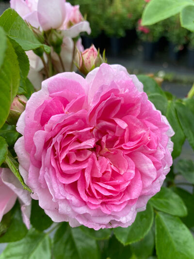 | Blüte: | Violettrosa, stark nostalgisch gefüllt, in Büscheln zusammen, schalenförmig, leichter Apfelduft, reich- und öfterblühend, 6 bis 7 cm groß |