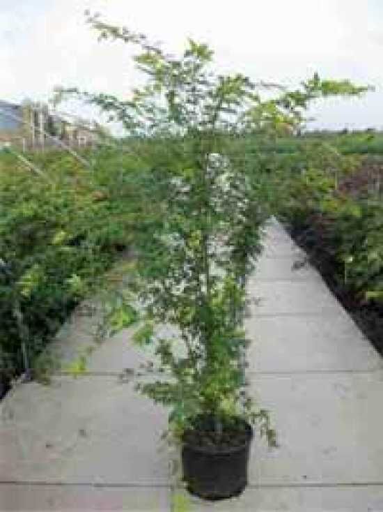 | Wuchs: | Kleiner bis mittelgroßer Strauch, baumartig und oft mehrstämmig, anfangs straff aufrecht und schlanker, im Alter rundliche bis schirmartige Krone und dicht verzweigt, bis zu 4 m hoch und ebenso breit |