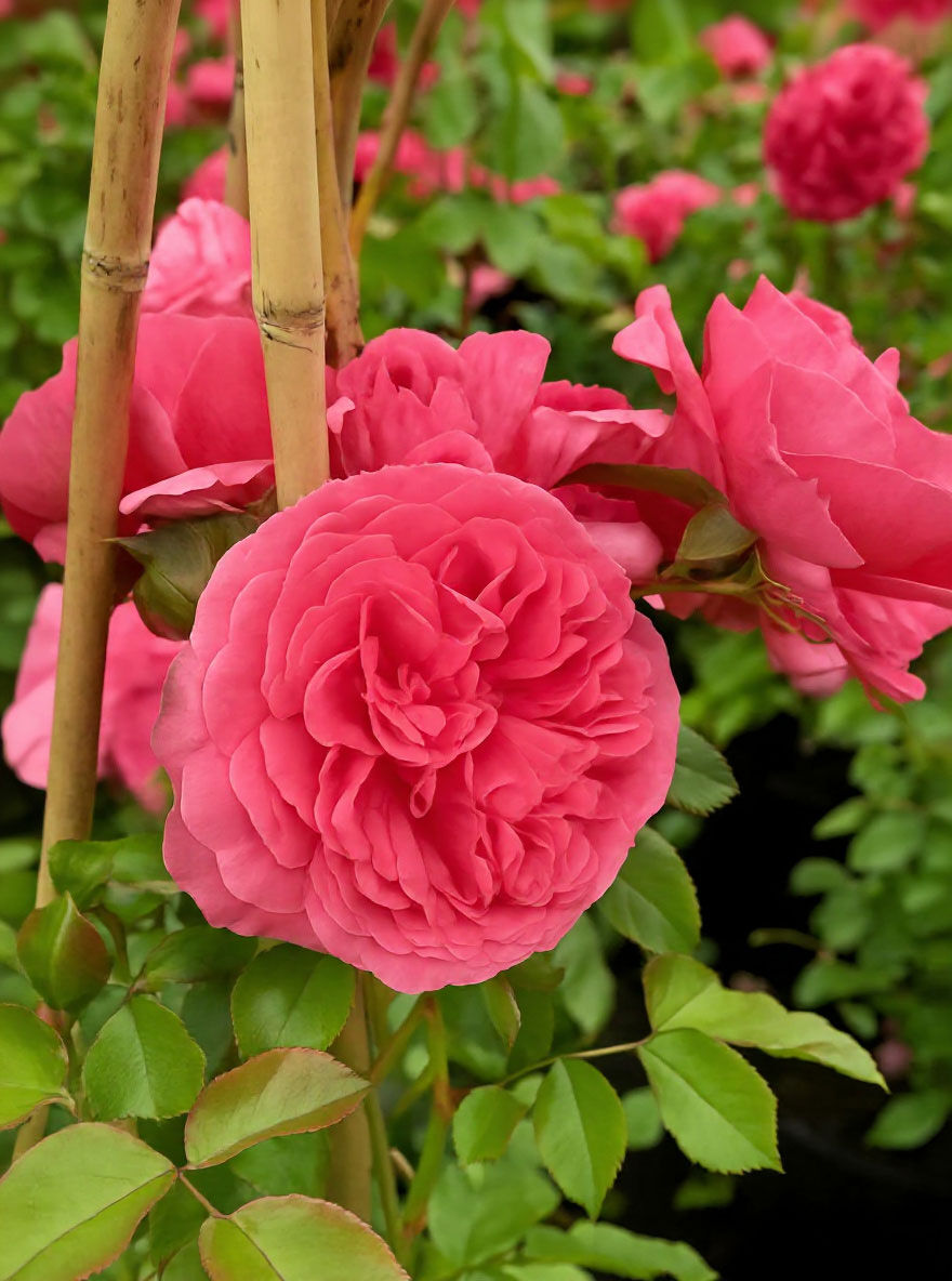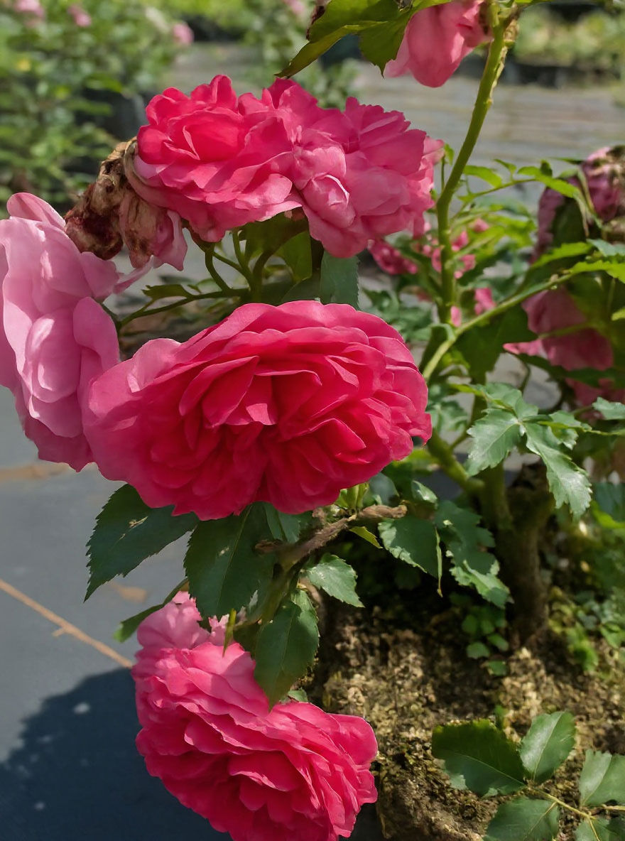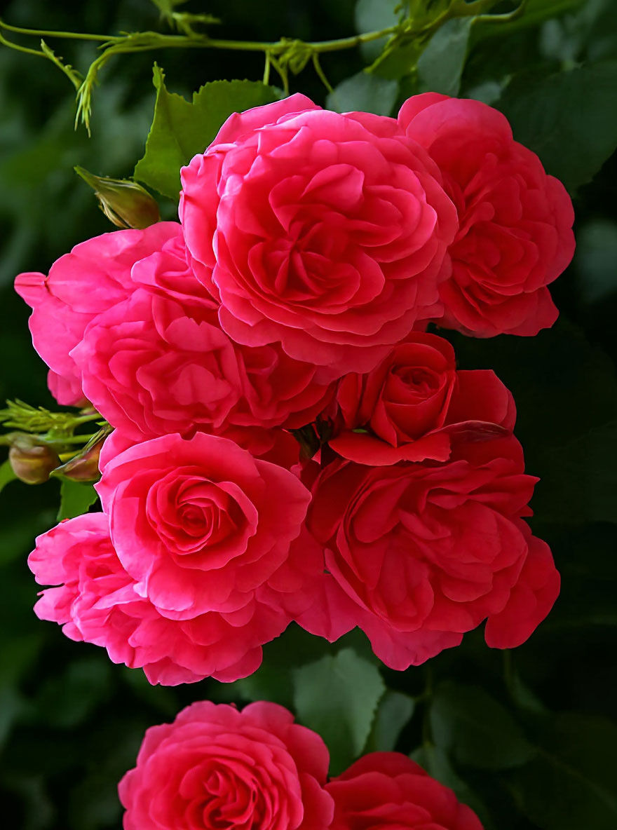 | Blüte: | Tiefrosa mit leicht silbrigem Schimmer, Knospe dunkelrosa, dicht gefüllt, in Büscheln, rosettenförmig, leicht nach Wildrose duftend, öfterblühend, ca. 11 cm groß. |