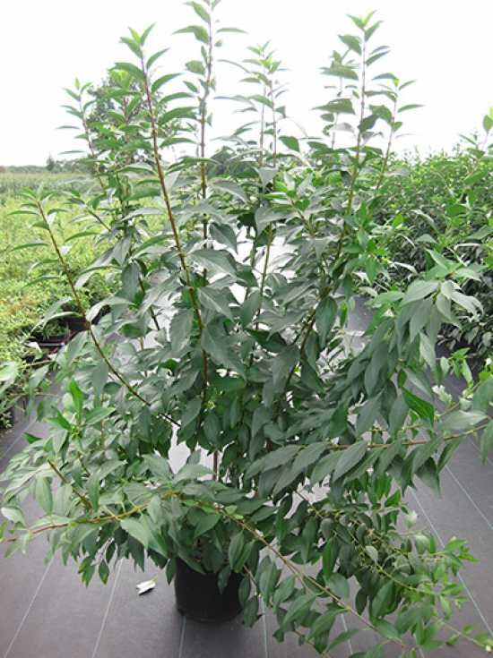 Wuchs: Mittelgroßer Strauch, anfangs schmal aufrecht, später breit-ausladend mit überhängenden Zweigen, 2 bis 3 m hoch und 2 m breit
