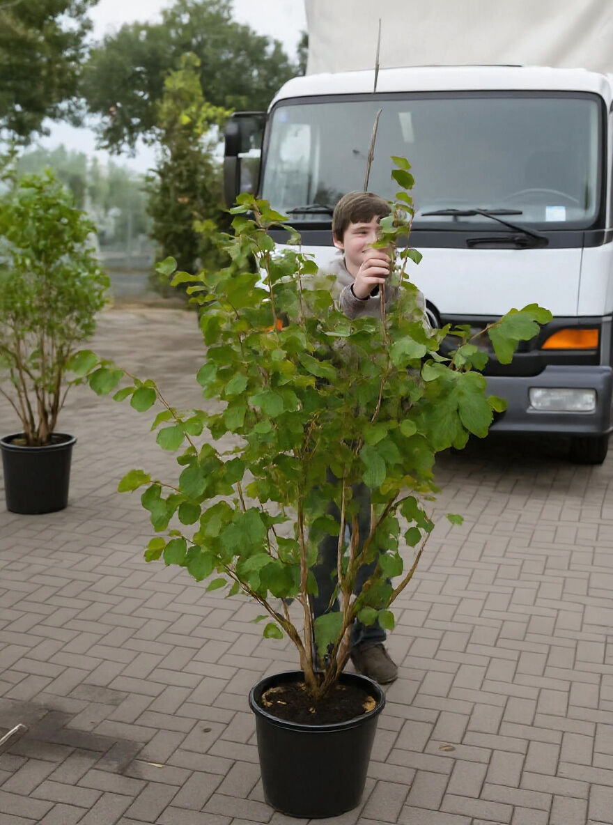 Zaubernuss (Hamamelis intermedia) 'Ruby Glow', mehrstämmiger Strauch im Topf C30, ca. 125–150 cm hoch.