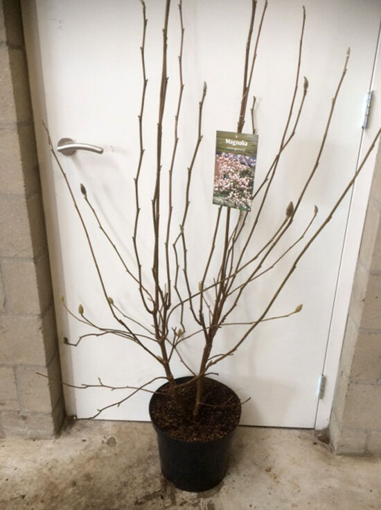 Magnolia soulangiana (Tulpen-Magnolie) 80-100 cm C10, laubfreier Strauch im Topf mit Knospen und Pflanzenetikett.