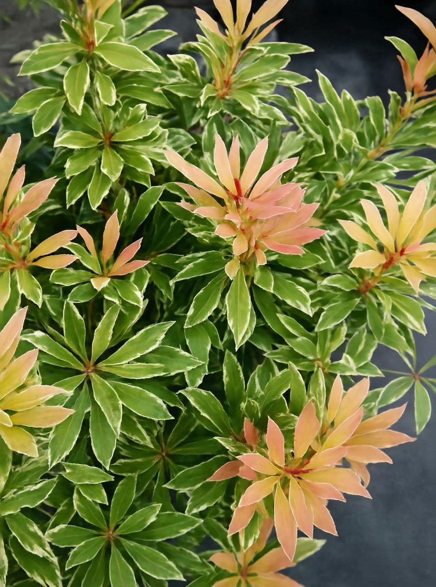 Pieris japonica 'Flaming Silver' / Japanische Lavendelheide 'Flaming Silver' als buschiger Strauch mit orangefarbenem Laub im Beet