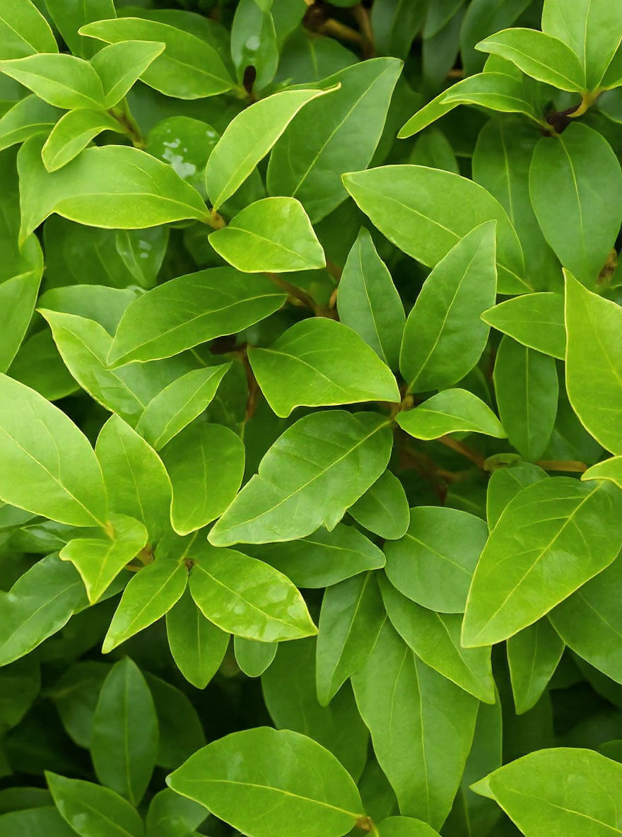| Blatt: | Immergrün, schmal eiförmig, am Ende zugespitzt, Oberseite dunkelgrün glänzend, Unterseite heller, 3 bis 8 cm lang. |