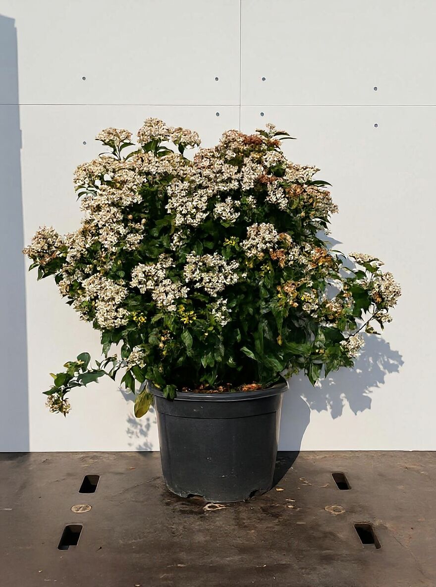 | Eigenschaften: | Der Viburnum tinus (Mittelmeer-Schneeball) ist ein wärmeliebendes und hitzeverträgliches Gehölz. Er ist besonders wegen seiner Anspruchslosigkeit, seiner tollen Belaubung und seiner attraktiven Blüte beliebt. Aufgrund der Schnittverträglichkeit kann er als vielseitiges Gestaltungselement dienen, z. B. als Kugel, Pyramide oder Säule. |