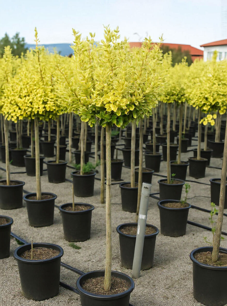 Ligustrum ovalifolium 'Aureum' / Gold-Liguster Hochstamm, kugelige Krone mit gelbgrünem Laub, 20–25 StU im Container