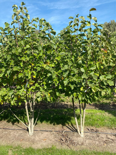 Magnolia 'Galaxy' / Großblumige Magnolie 'Galaxy', mehrstämmiger Strauch mit dichtem grünen Laub im Feldanbau.