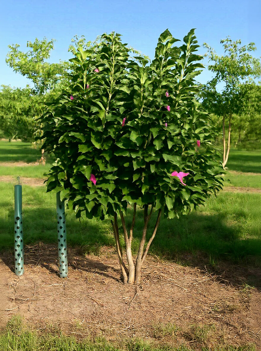 Magnolia 'Galaxy' / Großblumige Magnolie 'Galaxy', 200–250 cm, mehrstämmig, mit grünem Laub und rosa Blütenknospen.