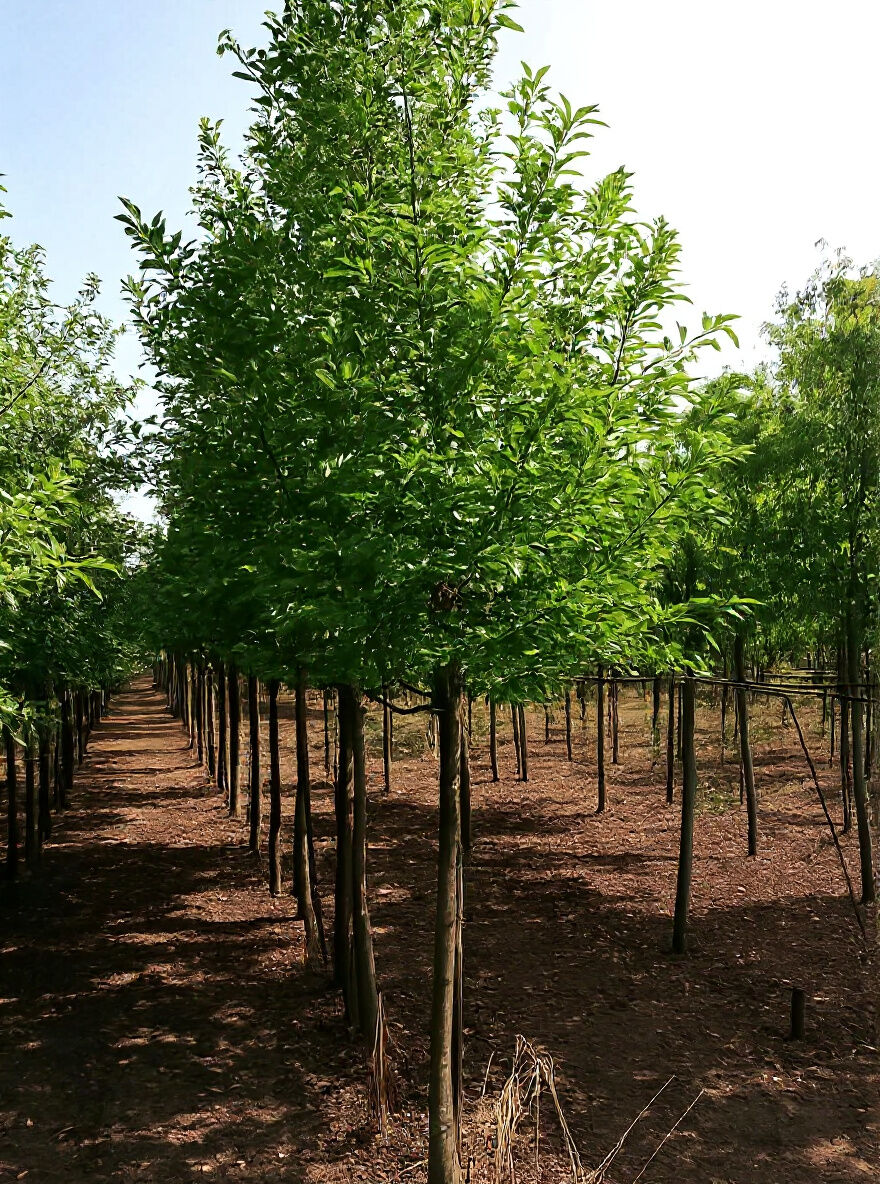 Magnolia kobus (Kobus-Magnolie) Hochstamm 14-16 StU, Baumreihe mit dichtem grünem Laub und geradem Stamm.