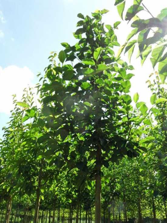 Magnolia kobus (Kobus-Magnolie) Hochstamm 16-18 StU, Baum mit aufrechtem Stamm und dichter grüner Krone.