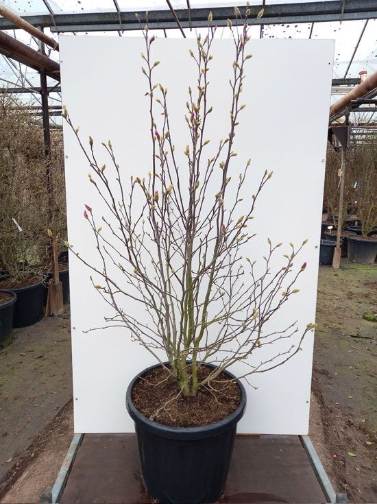 Die Rosa Stern-Magnolie präsentiert sich mit einem breit aufrechten und dicht verzweigten Wuchs. Sie wächst zumeist mehrstämmig zu einem großen Strauch oder kleinen Baum und erreicht eine Endhöhe von bis zu 5 Metern. Ihre flach-rundliche und unregelmäßige Krone begeistert nach einigen Jahren mit leicht überhängenden Ästen und verleiht der Selektion damit eine idyllische Ausstrahlung, die zum Träumen verführt.