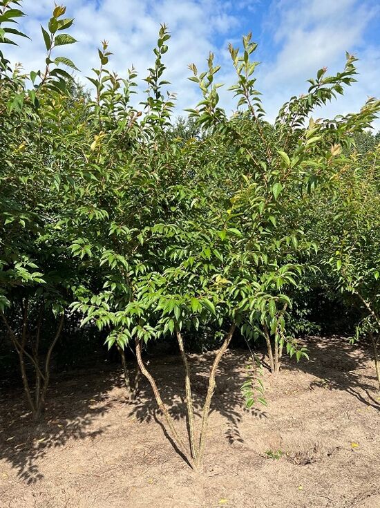 Markantes Blattwerk der Prunus subhirtella ’Autumnalis‘ strahlt hellgrün