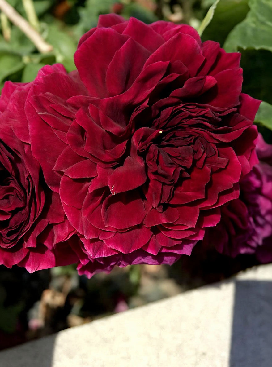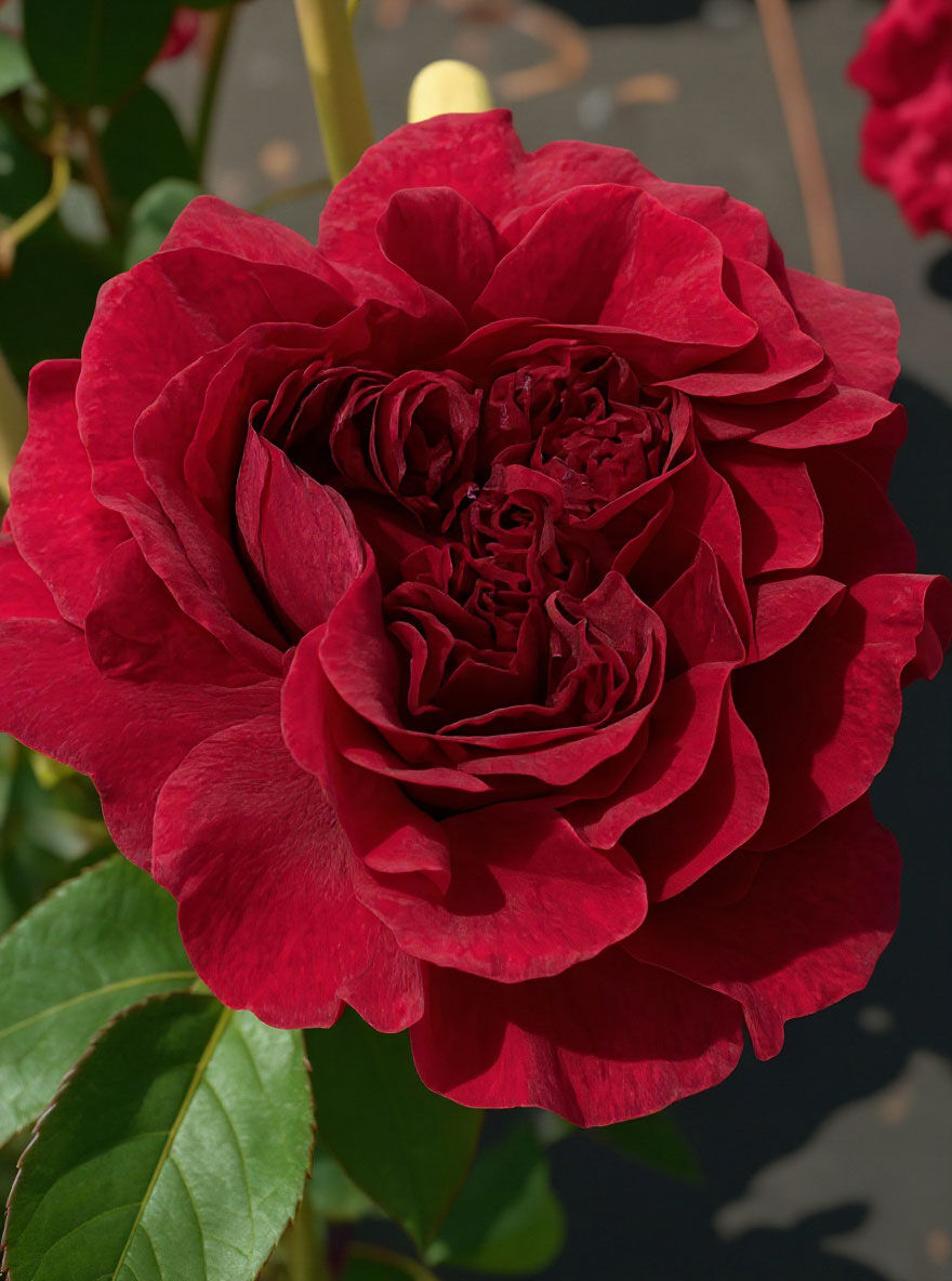 | Blüte: | Rot bis purpurrot, gut gefüllt, rosettenförmig, wohlriechend, klein. |
